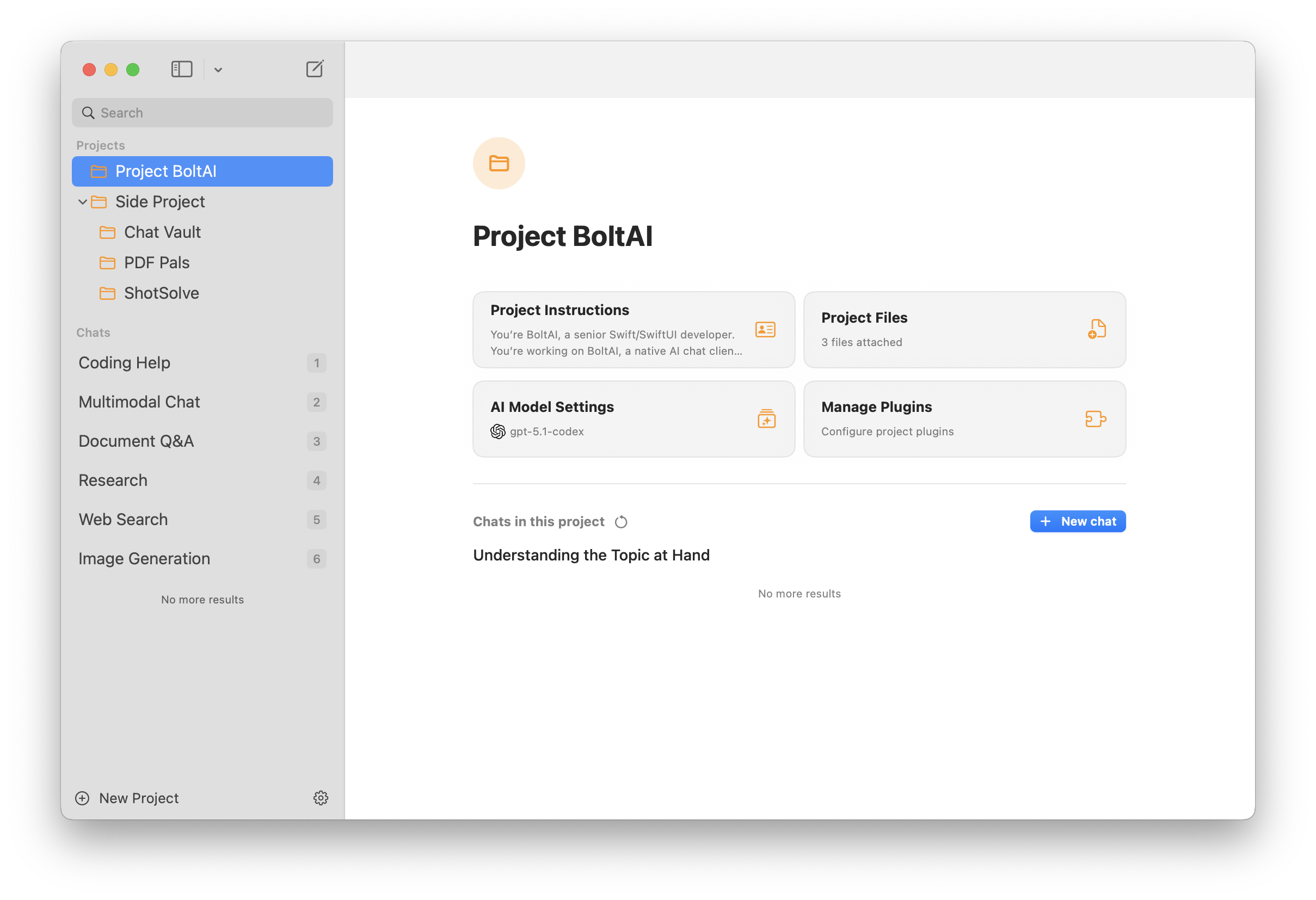 - Work with projects, multi-chat threads, forking, and reusable agents to keep everything structured. BoltAI scales from quick prompts to complex long-running workflows.