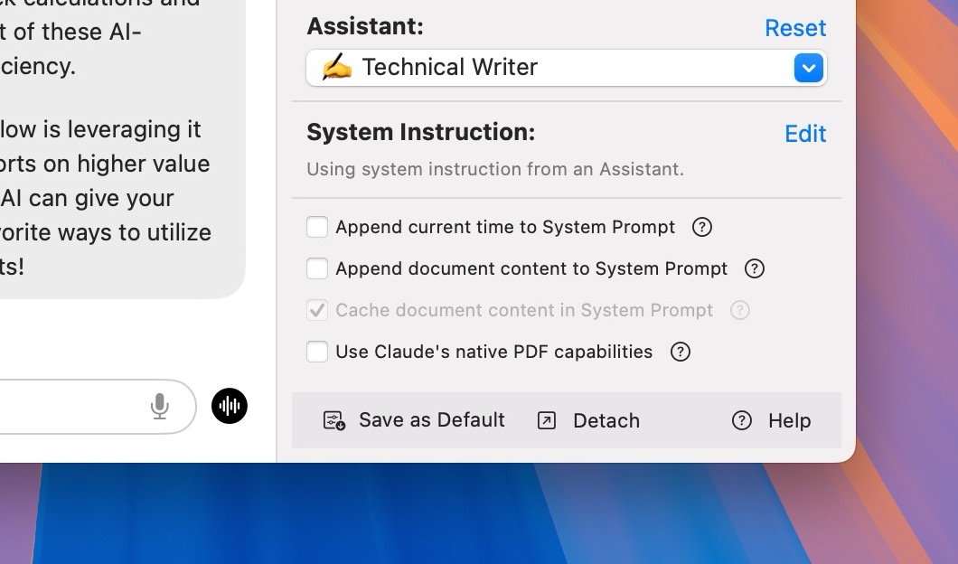 You can easily select an Assistant, or customize the System Instruction in the Inspector pane.