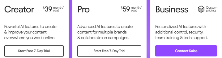 - Creator Plan ($39/month): Provides one user seat, 50+ AI templates, brand voice customization, and document editing tools. Ideal for solo content creators.